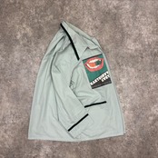 1919年創業、ドイツのシャツメーカー ザイデンステッカー。こちらは1970年製の紳士用パジャマ。化繊が台頭してきた1970年代らしい配色と襟の形。細番手の綿糸とポリエステルを紡績する事で綿織物特有のシワを回避しています。淡いミントグリーンと深いグリーンの配色は、アメリカにも日本にも無い独特の清涼感。更に深いグリーンを補う様にチェコのビンテージファブリックポスターを配置して、オリジナルの職業ワッペンFLOPPYDISK SALES MANAGERで、無国籍で頼りないワークシャツジャケットの完成。足元にグリーンが差し色のスタンスミスとか、カーキのミリタリーパンツとか、グリーングリーンなスタイリングに是非。